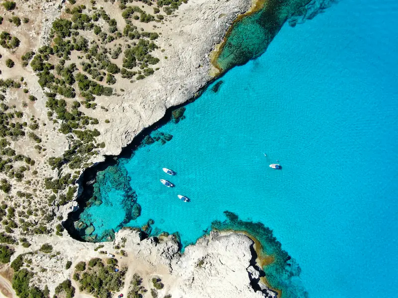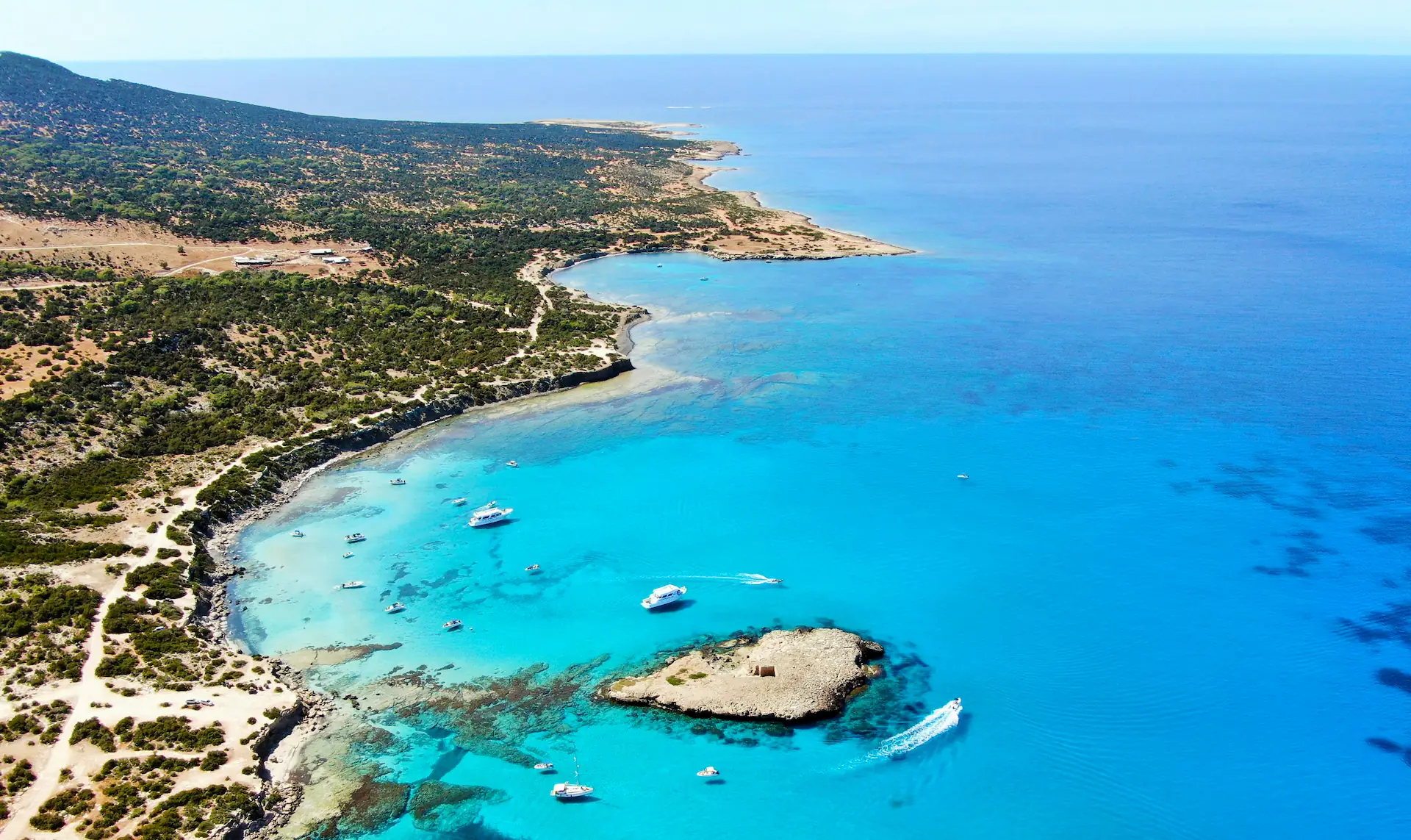 Blue Lagoon: turkusowa zatoka u wybrzeży półwyspu Akamas, jedno z najpiękniejszych miejsc kąpielowych na Cyprze. Rejs łodzią i pływanie w krystalicznej wodzie to jeden z najbardziej relaksujących momentów wyjazdu.