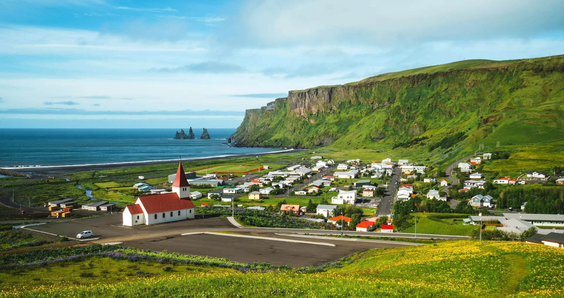 Vík: krótki postój w nadmorskiej wiosce, czas na kawę i widok na ocean.