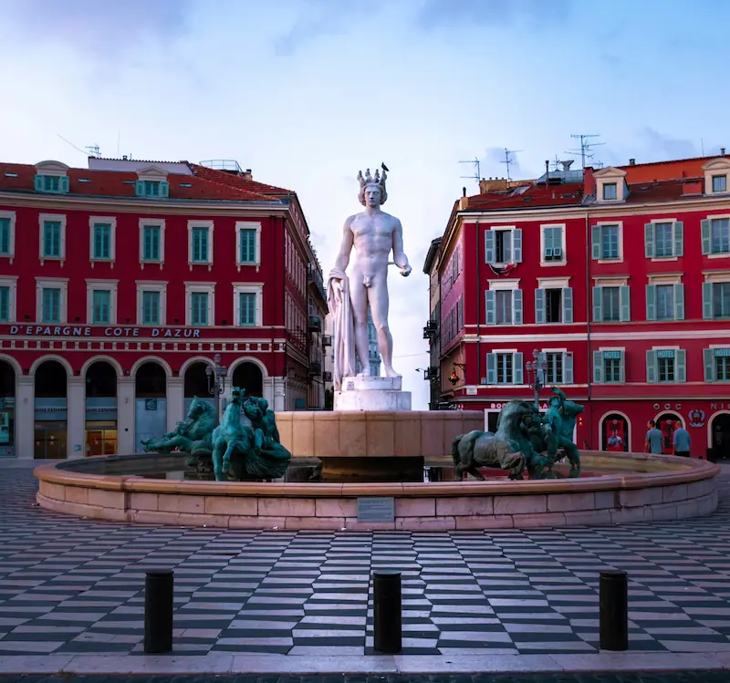 Plac Masséna: centralny plac Nicei z charakterystycznymi fasadami i nowoczesnymi instalacjami.