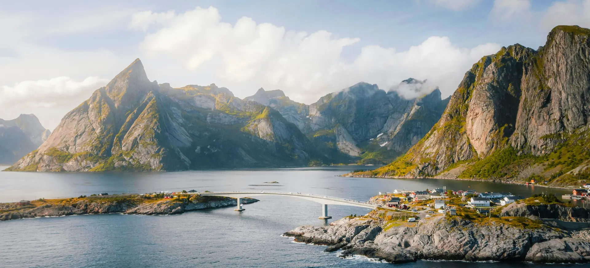 Wieczorny przejazd przez archipelag: Pierwsze mosty, fiordy i górskie panoramy witają nas po zejściu na ląd.