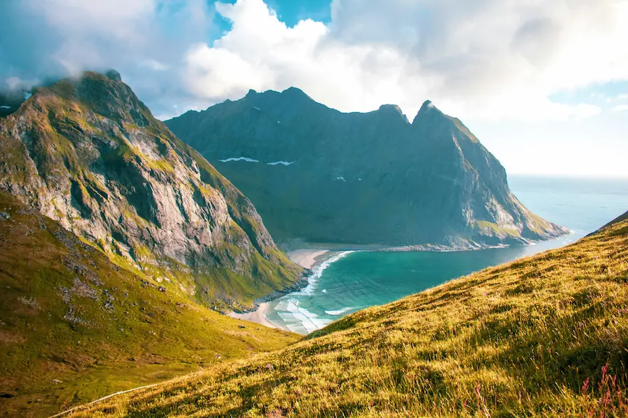 Skagsanden Beach: Jedna z najbardziej fotogenicznych plaż regionu zachwyca jasnym piaskiem i górskim tłem.