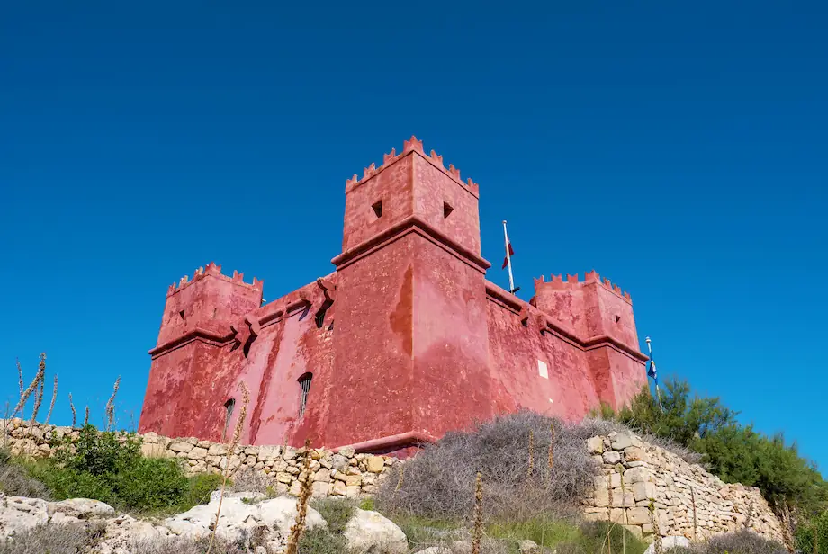 Czerwona Wieża: widoczna z daleka wieża świętej Agaty, niegdyś punkt ostrzegawczy, dziś miejsce z panoramą 360 stopni na Maltę i Gozo.