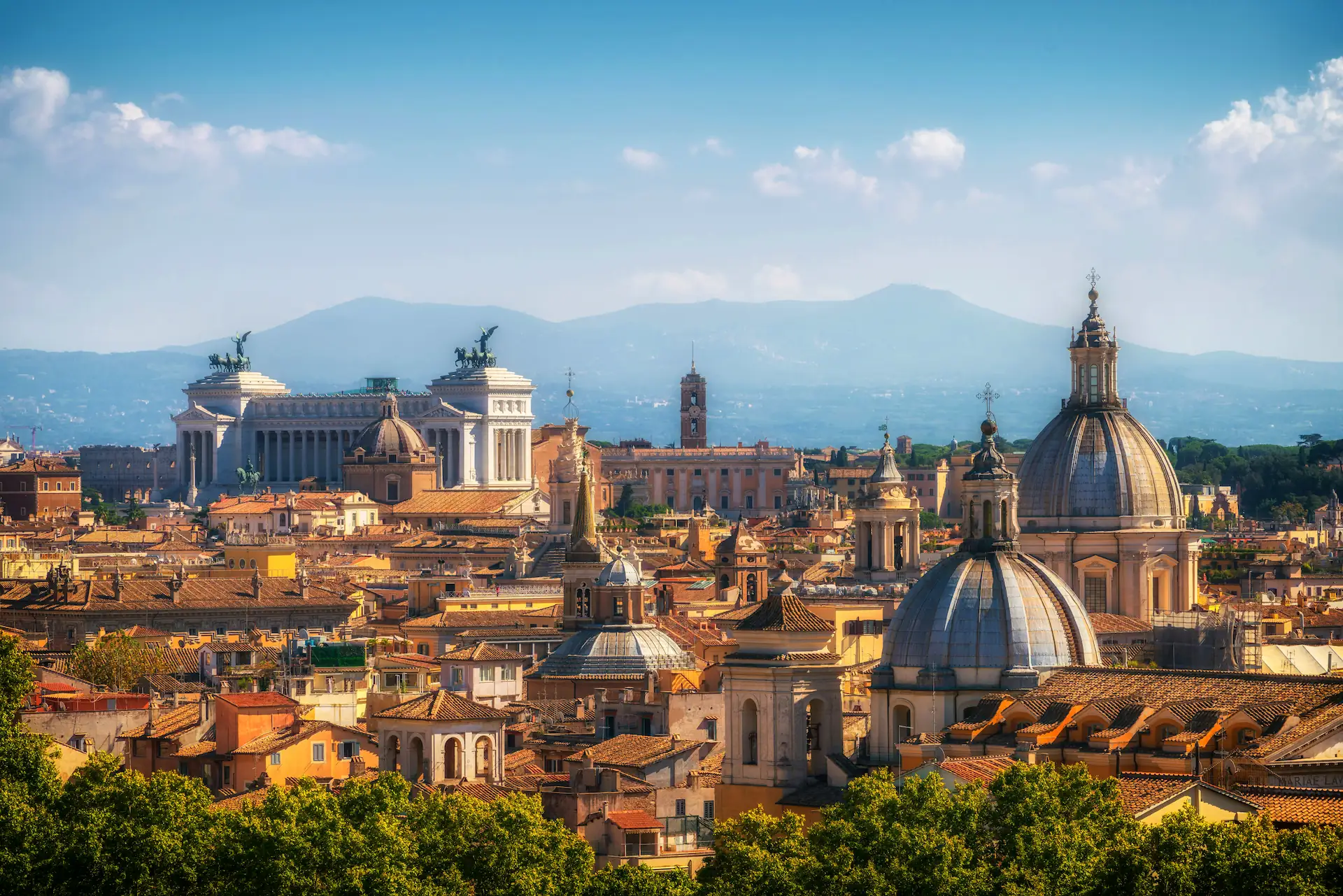 Kapitol i Plac Wenecki: centrum Wiecznego Miasta z pomnikiem Wiktora Emanuela II i widokiem na wzgórza.