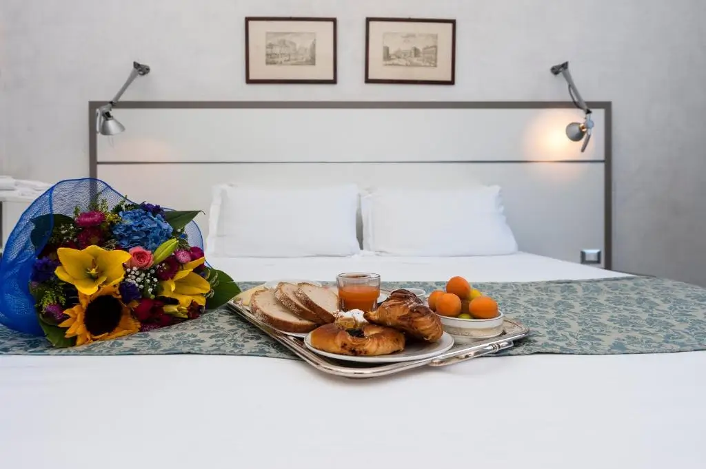 Śniadanie w hotelu: klasyczne włoskie śniadanie – kawa, pieczywo, ewentualnie coś słodkiego.