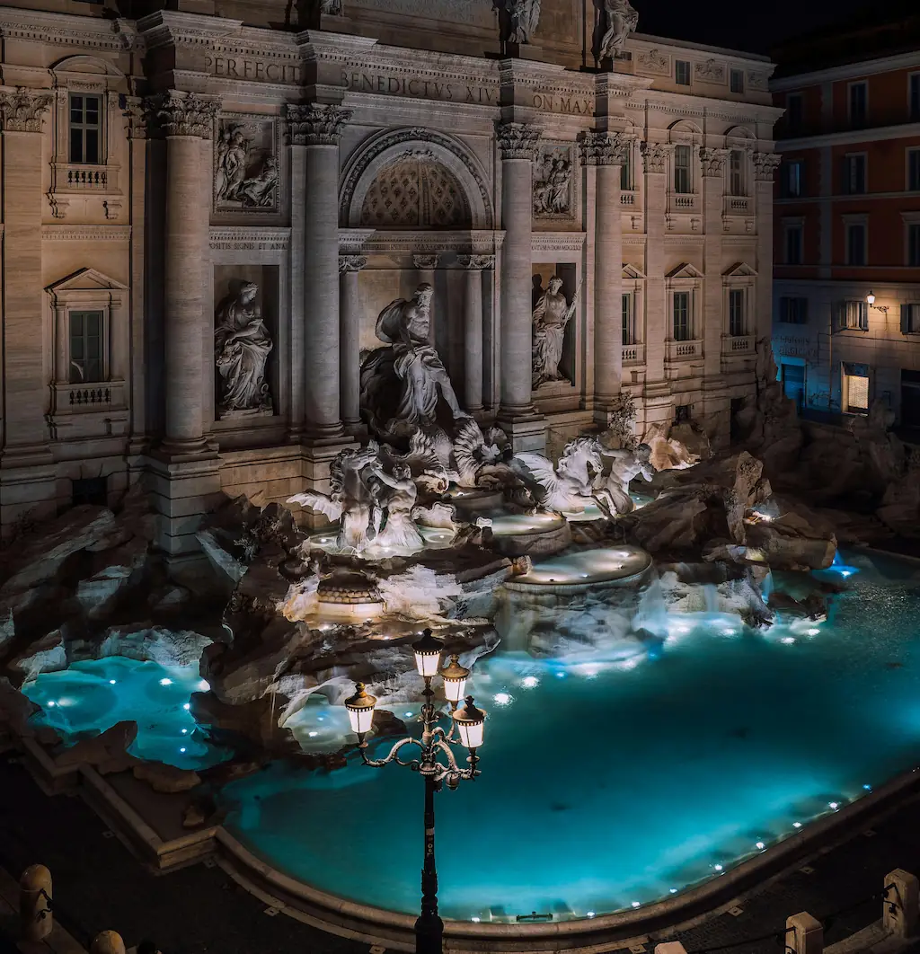Fontanna di Trevi nocą: obowiązkowy punkt każdej wycieczki do Rzymu – wrzuć monetę i wróć tu kiedyś.